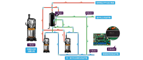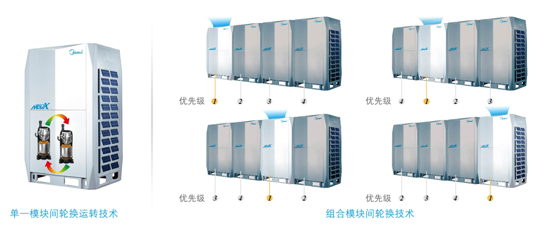 系統(tǒng)根據(jù)系統(tǒng)負荷情況,輪換設(shè)置優(yōu)先開啟的室外機模塊的壓縮機順序,平衡分配每臺室外機模塊的運行時間,大大提高了機組的可靠性和使用壽命。