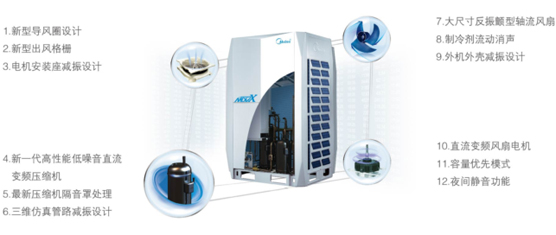 利用CFD、FEM等先進技術(shù)對空調(diào)系統(tǒng)的元器件振動源進行優(yōu)化,實現(xiàn)靜音運轉(zhuǎn),夜間運行模式把噪音降低到最低。